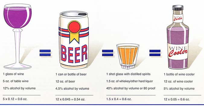 Alcohol EquivalenciesAs shown in the following diagram, the absolute amount of ethyl alcohol that a drinker consumes is approximately the same for a 5 ounce glass of wine, a 12 ounce can or bottle of beer, and a standard shot of distilled spirits. In each case, one drink equals a little more than a half-ounce of alcohol. Of course, the larger the wine glass or beer bottle, the greater the amount of alcohol. Also, some beverages such as fortified wines and malt liquor contain more alcohol by volume than ordinary wine or beer. |