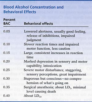 Behavioral Effects of BACSome of the behavioral, perceptual, and pathological effects that individuals tend to experience at different levels of BAC are shown in the next table. Although it is not shown in this table, a BAC of 0.60 is virtually certain to produce death due to depressed functioning of the respiratory system or heart. |