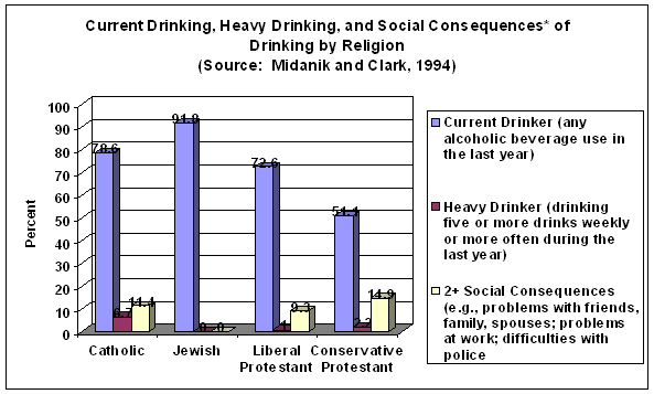 Religion and Cultural Norms toward Alcohol UseThe norm qualities explanation of deviant drinking is based on a long tradition of macro-level research on the relationship between rates of alcohol use and drinking problems and religious affiliation in the U.S. The contrasting drinking patterns of two particular groups in North AmericaJews and conservative Protestantshave received special attention because of their paradoxical nature. On the one hand, Jewish drinking patterns are noteworthy for (a) the relatively high prevalence of alcohol use among adolescents and adults and (b) the markedly low prevalence of alcohol-related problems among Jewish drinkers. This distinctive pattern suggests that something in their cultural norms about drinking protects Jews from the risks of early and widespread exposure to alcohol. On the other hand, conservative Protestant groups, such as Southern Baptists or Mormons (Latter Day Saints), are well-known for a culture that discourages any alcohol use. In fact, members of conservative Protestant churches are more likely than other Protestants to be life-long abstainers from alcohol. Yet, when people who were raised in these fundamentalist religious groups do drink, some evidence indicates that they are significantly more likely than Jews or more liberal Protestants to experience drinking problems. Thus, this side of the religious paradox suggests that prohibitionist cultures and policies may, ironically, promote uncontrolled and troublesome drinking among those do, for whatever reason, use alcohol. ![]() A well-designed national survey of U.S. drinking patterns conducted by Midanik and Clark (American Journal of Public Health, 1994) provides some interesting evidence on these and other religious differences in alcohol use and drinking problems. Interviews were conducted in 1990 with a sample of over 2,000 respondents who were representative of the U.S. adult population aged 18 years and over. The interview instrument included a number of measures of alcohol use and drinking problems, including items dealing with "social consequences" of drinking such as interpersonal problems with friends, family, or spouses and problems at work or with the police. The graph on the right reports some of Midanik and Clark's key findings about religious differences in (1) current alcohol use, (2) heavy drinking, and (3) social consequences of drinking. The results for Jewish respondents are remarkable. Whereas over 90 percent of this group are current drinkers, none of them met the criteria for heavy drinking (i.e., five or more drinks weekly or more often during the past year). Furthermore, none of the Jewish respondents experienced two or more social consequences from drinking. Thus, alcohol problems appear to be virtually non-existent among Jewish drinkers. Some sociologists have described Jewish drinking culture as being "prescriptive" in nature, in that Jews learn a variety of rules and practices about alcohol, mostly wine, from an early age. These shared prescriptive understandings about alcohol provide Jewish drinkers with clear guidelines and limits that effectively regulate and constrain their drinking behavior. In short, when Jews drink, they know how to drink Midanik and Clark's findings for conservative Protestants differ substantially from the Jewish results as well as from the results for liberal Protestants. First, only slightly more than half of conservative Protestants are counted among current drinkers, which is not surprising in light of the prohibitionist stance of the groups included in this category. Yet, a higher percentage of conservative Protestants are heavy drinkers (2.2 percent) than are liberal Protestants (1.0 percent). Even more dramatically, almost 15 percent of the conservative Protestants encountered problematic social consequences because of their drinkinga rate of social consequences that exceeds even the heavier drinking Catholic group. This result, of course, reflects the strong social reaction to deviant drinking in the so-called "proscriptive" culture of conservative Protestants. Even if Protestants are generally less likely to drink than other groups, they are more likely to be labeled as deviant if they should happen to cross the proscriptive normative boundary of this culture and begin to drink. It is also likely that they know less about how to handle alcohol and limit their consumption than do drinkers from more prescriptive cultures. When the main thing one has learned about alcohol is "don't drink it," this doesn't provide a great deal of guidance when one crosses over to the "other side" and drinks. Because of their ethnic and cultural diversity, Catholic drinking patterns are difficult to characterize. Some predominantly Catholic groups, such as Italian Americans, are somewhat similar to Jewish Americans in that they are quite likely to drink, at least occasionally, but they are not particularly likely to develop drinking problems. However, Irish Catholics in the old country and in the U.S. have relatively high rates of alcohol problems. Similarly, German Catholic groups tend to be heavy consumers of beer and other alcoholic beverages. On the whole, Catholic and liberal Protestants fall between the other two groups in prevalence of current drinking and social consequences. Norm qualities theory emphasizes the crucial difference between prescriptive drinking norms and proscriptive drinking norms because it has a number of important implications for social policies to deal with alcohol problems. For instance, some social scientists argue that more attention should be given in the U.S. to socializing adolescents into patterns of safe or "responsible" drinking—an more-or-less prescriptive strategy—instead of continuing the strong proscriptive emphasis on "zero tolerance" of drinking for teenagers. This theoretical perspective alerts us to the need to do more to prevent and manage drinking and drug problems than to "just say no."