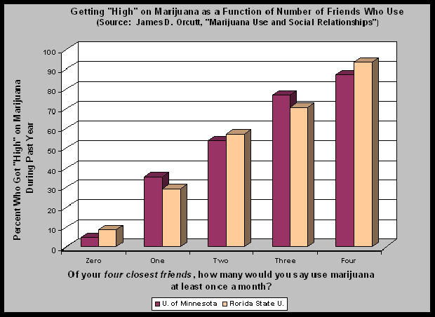 In a study of marijuana use among college students, "Differential Association and Marijuana Use," Orcutt examines the close parallels between Becker's empirical account of the process of becoming a marijuana user and Sutherland's micro-normative theory, which we examined earlier. This study also illustrates some of the uses and limitations of survey research for examining the influences of social relationships and personal attitudes on the deviant act of marijuana use. The data for this study were collected from two universities in the early 1970s, when marijuana use was on the increase in the U.S. As shown in the following graph, the results show a strong relationship between students' own use of marijuana and the number of their four closest friends who use marijuana. When none of a student's closest friends use marijuana, the chances of that student using are less than one out of ten. On the other hand, when all four friends are users, approximately nine out of ten students are themselves users. What are the odds of marijuana use when two friends use and two friends do not use? Sutherland's theory of differential association would predict a 50/50 split under these circumstances, which is close to the results shown below for both universities. These and other findings from this and more recent research on alcohol- and drug-related deviance (Akers 1998) provide solid support for Sutherland's position that intimate, personal relationships are the primary source of learned techniques, definitions, and motives for deviant behavior.