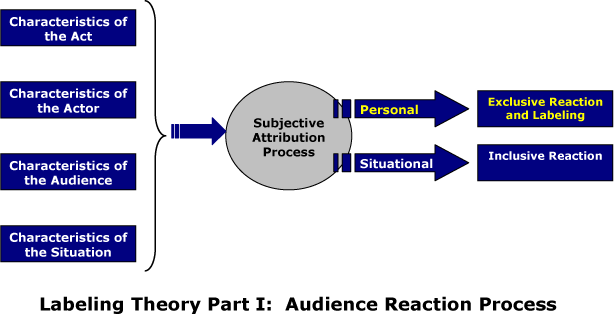 In general, labeling (or social reaction) theorists focus on two related, but distinct processes through which deviant meanings become attached to actors and behaviors. First, most labeling theorists argue that the phenomenon of "deviance" is interactionally created through a complex process of audience reaction to an act or actor in a given social situation. The basic elements in this process are depicted below as Part I of labeling theory. When social audiences encounter troublesome behavior and people, characteristics of the act, the actor, the audience, and the situational context jointly influence the audience's subjective interpretation or causal attribution of the source of the "problem." Does the audience interpret the problem as an expression of personal attributes of the actor (such as a genetic flaw or a chronic mental disorder) or is the problem attributed to situational circumstances or pressures? Personal attributions tend to result in exclusive reactions, such as rejection of the actor from conventional groups, and labeling of the actor as deviant. For example, this would be the case when a family can no longer deal with a "hopeless drunk" and terminate their relationship. On the other hand, situational attributions generally lead to inclusive reactions aimed at modifying the actor's troublesome behavior without excluding him or her from conventional group relationships. Families may spend years trying to persuade a problem drinker who is "simply under stress" to alter his or her behavior. A crucial issue for research and treatment of alcohol problems is understanding the dynamics of labeling and audience reaction to deviant drinkers in the family and in other social relationships.