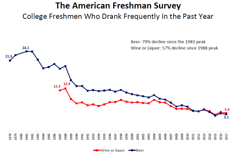 College Drinking Has Also DecreasedThere is little evidence of increases in alcohol use or deviant drinking among college students in recent decades. To the contrary, an annual survey of first-year college students known as The American Freshman Survey conducted by the Higher Education Research Institute (HERI) has recorded a steady decline since 1981 in the percentage of freshmen who drink beer, wine or liquor frequently. The graph below, which depicts the declining longitudinal trend in "frequent" drinking among college freshmen, is adapted from a website sponsored by the brewers of Budweiser and other popular brands of beer, the Anheuser-Busch Companies: http://www.alcoholstats.com. In particular, the percentage of frequent beer drinkers has declined dramatically from a peak of 24.1% in 1981 to only 5.1% of freshmen in 2017. If you want to see additional results from this survey of first-year college students, more information is available at the HERI website: https://www.heri.ucla.edu/monographs/TheAmericanFreshman2017.pdf |