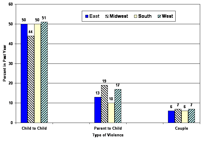 Straus et al. designed their survey carefully to obtain valid responses from interviewees and to minimize under-reporting of violence. However, several limitations of this study should be noted: (1) over a third of the sample (35%) failed to complete the interview or could not be contacted; (2) no interviews were conducted in single-parent households; and (3) data were not collected on parents' acts of violence toward children under the age of three. In light of these sources of "missing data," it is possible that the rates of violence reported by Straus and his associates may actually under-estimate the overall prevalence of domestic violence in the U.S. The measure of domestic violence in this study was the "Conflict Tactics Scale" that Straus developed. This multi-item scale includes non-violent methods of conflict resolution in domestic situations, such as discussion and compromise, as well as relatively mild forms of violence, such as pushing or shoving (see the list on page 3 of this unit). However, Straus et al. focus most of their attention on potentially injurious forms of abusive violence: "acts where people punched, kicked, or bit a family member, hit the person with a hard object, 'beat up' another person, or shot, or tried to shoot, stabbed, or tried to stab, another family member" (1980: 22). The following graph depicts regional variations in three types of abusive violence and shows that acts of violence between siblings (child-to-child) are by far the most common form of domestic violence (adapted from Straus et al., 1980: 128-129). Nearly half of the households with two or more children was the scene of abusive sibling violence within the year preceding the survey. In contrast, parent to child violence was reported in about 15 percent of households and couple violence (including both male-to-female and female-to-male violence) occurred in 7 percent of families. It is interesting that the South shows the lowest rate of abusive violence of parents toward children, casting doubt on criminological theories and popular stereotypes about a "southern subculture of violence." |