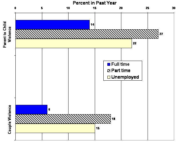 Employment and Abusive ViolenceEconomic stress is among the primary factors that Straus et al. find to be associated with the incidence of abusive violence in American households. For instance, as shown in the following graph, they find a strong relationship between the employment status of husbands and abusive violence toward children and spouses. As compared to households where the husband is employed full time, families with a husband who is employed part time show nearly twice the rate of parent-to-child violence and three times the rate of violence between spouses. Families with unemployed husbands also show substantially higher rates of abusive violence than those with husbands who are employed full time. Reflecting on the implications of these findings, Straus et al. (1980: 150) suggest that "it would certainly not be unreasonable to expect that the rates, and deadly toll, of family violence would fluctuate with national and local rates of unemployment." The next time you hear that the unemployment rate has risen, think about the potential implications of this for what goes on "behind closed doors." |